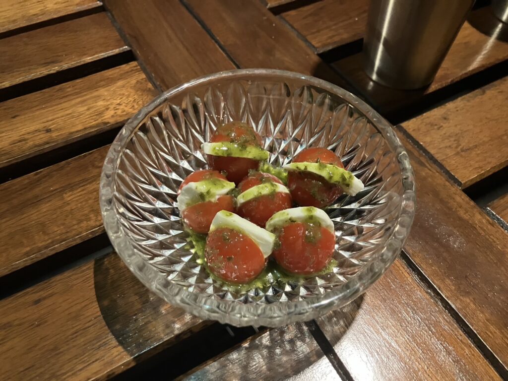 旦那が火を起こしてくれている間に、子供と一緒にカプレーゼをいただきます^^