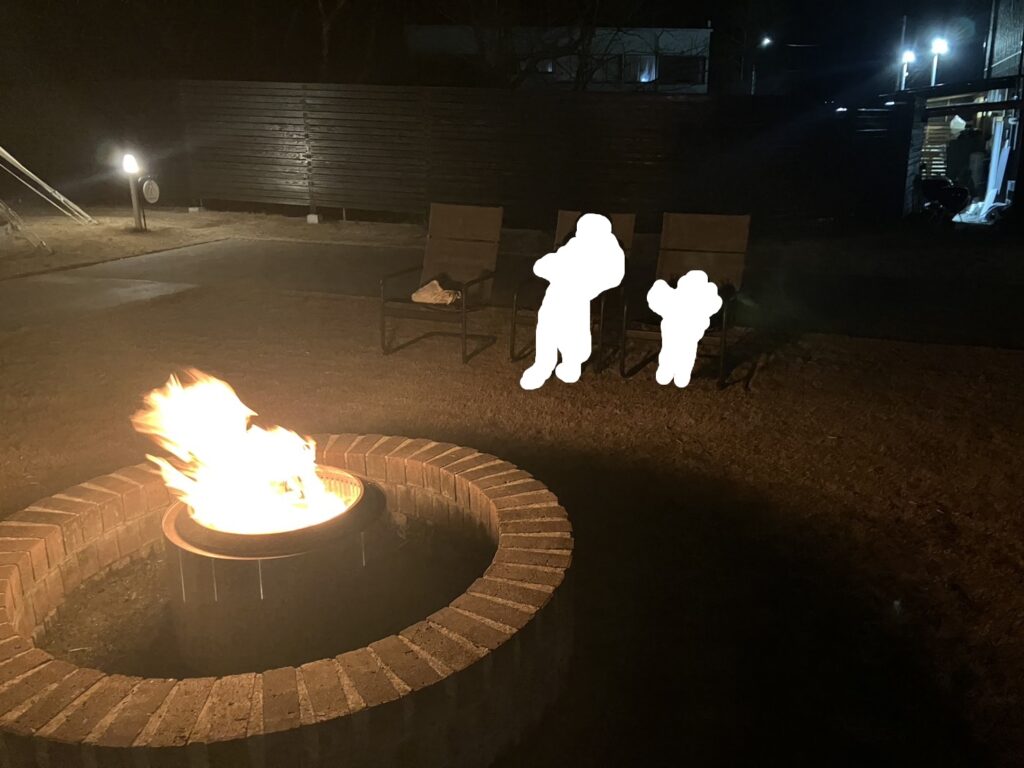 BBQとともに、キャンプファイアを眺めながらお酒をたしなむ・・・最高じゃないですか!!!私は下戸ですが。