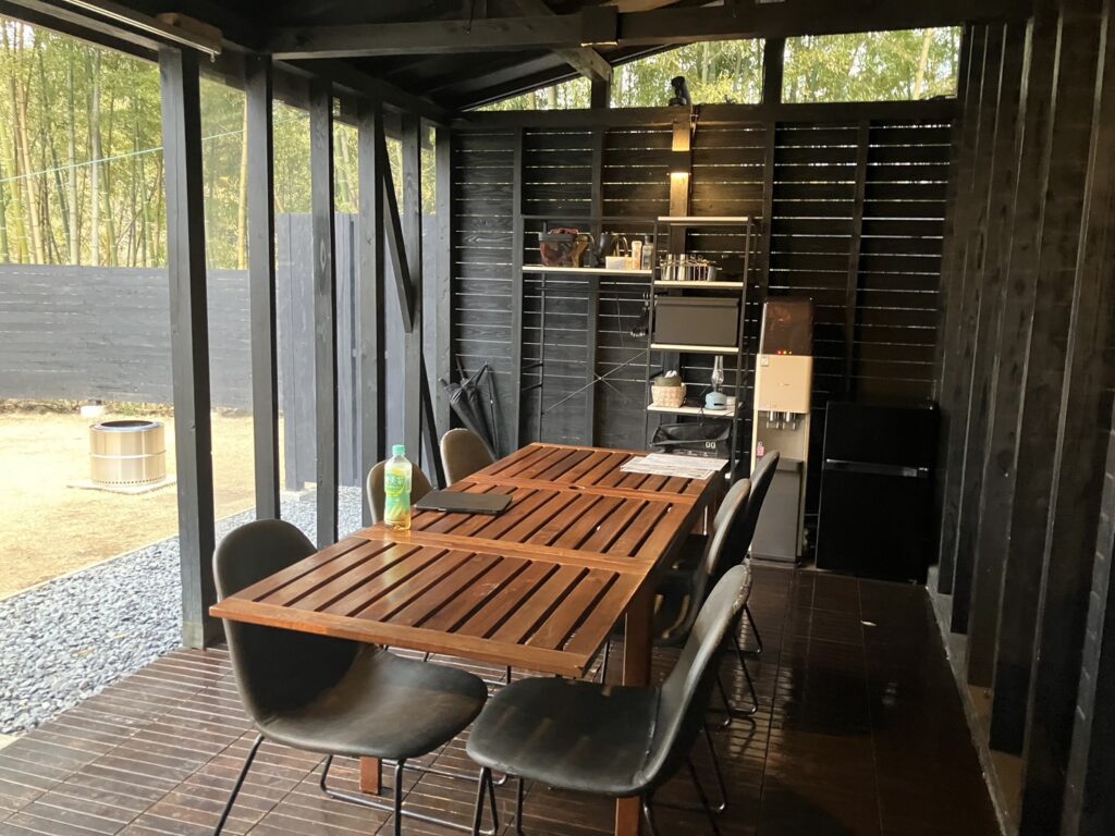 夕食・朝食ともに、食事は写真右の東屋みたいなやつ(ガゼボ?という?)でいただきます。