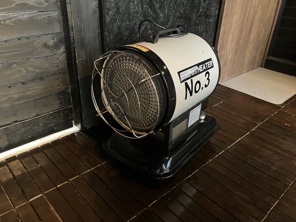 でも、ちゃんと業務用の音が半端ないバズーカみたいなヒーターがしっかり仕事してくれたので暖かく過ごせました。