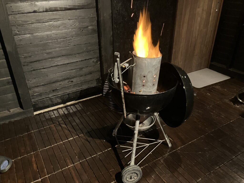 BBQの火は、自分たちで起こします。起こすといっても、もう炭をセットしてあり、固形燃料にチャッカマンで着火するだけです。ありがたや・・・。