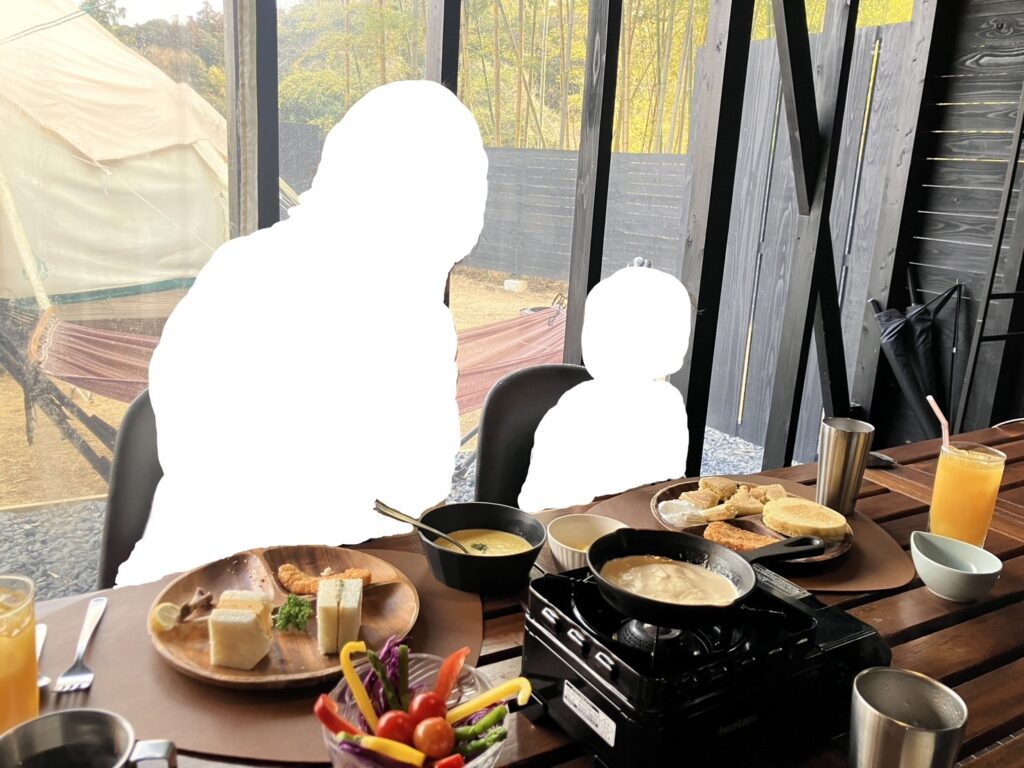 夕飯も朝食も、キャビンではなく、キャビンの隣の東屋(ガゼボってAIが言ってる笑)?でいただきます。