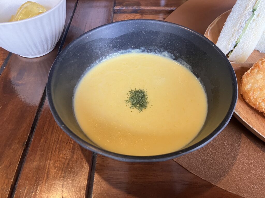 温かいコーンポタージュもついています。
