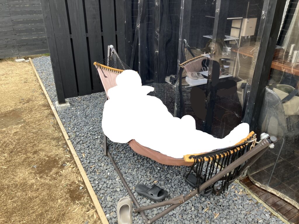 ガゼボ横にハンモックがありましたので、おなかいっぱいの旦那と息子はそこでしばしダラダラしていました。