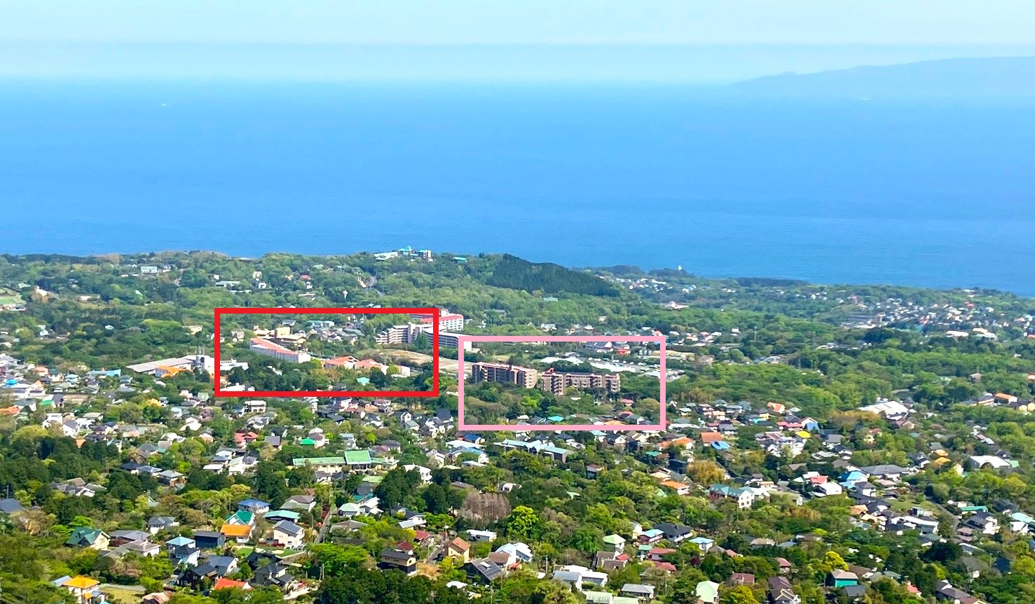 ちなみに、大室山の頂上から見下ろすと、エクシブ伊豆(赤枠)とヴィラージュ伊豆高原(ピンク枠)の建物がよく見えます。