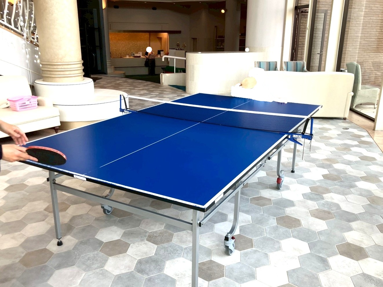 チェックイン時、天井の高ーいロビーに、卓球の台がおいてありました。